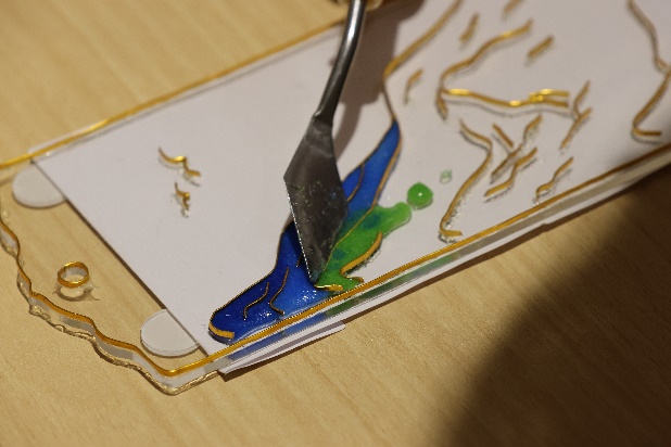 在动手实践环节,同学们专注投入,以铜丝为笔,勾勒出梅兰竹菊、云纹水波等传统纹样;再以彩砂为墨,细心填充点缀。金丝立骨,彩釉流光,原本平面的图案逐渐立体生动起来。现场气氛静谧而热烈,指尖的每一次轻捻都传递着对非遗技艺的敬畏与热爱。